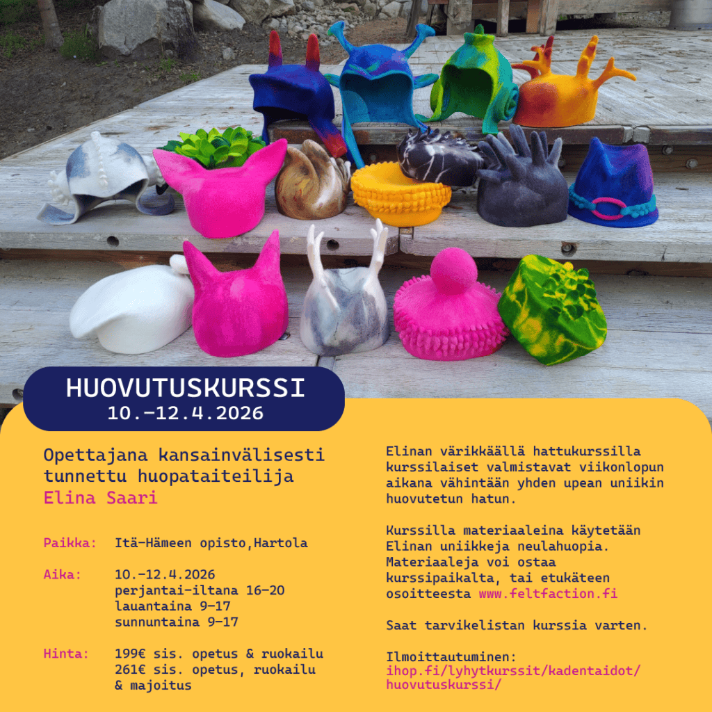 Lisätietoja ja ilmoittautuminen kurssille osoitteessa https://ihop.fi/lyhytkurssit/kadentaidot/huovutuskurssi/